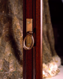 The designers specified uninterrupted viewing from two sides that involved the glass being a structual element in the design. Lighting was also critical so we developed a fibre optic network hidden in the cornice. Bronze handles were cast to a pattern made from one of the original cabinet handles.